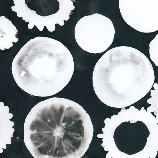 フォトグラムは、印画紙上に直接物を置いて懐中電灯などで感光させる方法により制作された写真技法で、レイヨグラムともよばれます。この技法を用いた作家として、マン・レイが有名です。これは、蚊取り線香、工具、果物や野菜などを置いて実験的に制作した作品の一部です。
