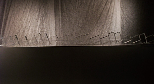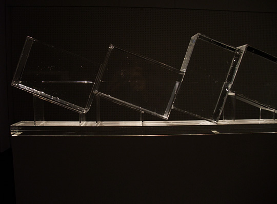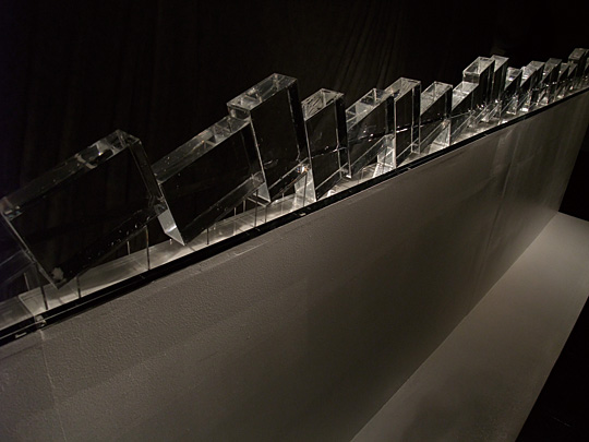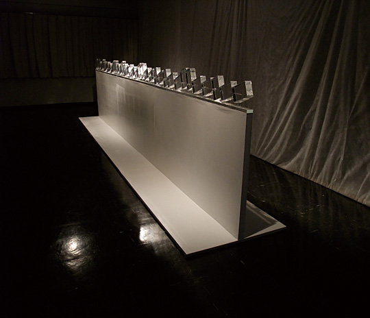 水とオイルで満たした六面体に存在する光の面をそれぞれに傾けた六面体で繋げたインスタレーション作品です。様々な「閉じたゲットー」とその中にある二面性を表現し、自由な形で連なっているように見える六面体も同じ傾斜を持つという普遍の真理が存在し、それゆえに一つの面における連続した秩序を表しました。