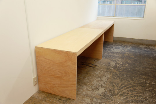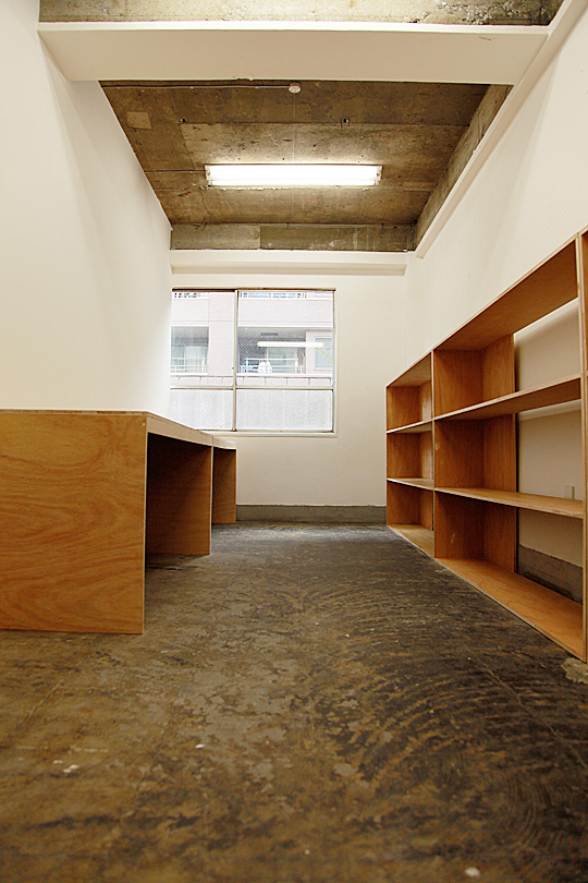 横浜中華街にあるタイプデザイナーのアトリエの一室です。彼の課題は、仕事柄多くの本を取り扱うために散乱した書籍を整理することでした。そこで、長方形型をした部屋の形を利用して、水平ラインを強調した棚と机を製作しました。必要最小限の構造で構成し、棚は部屋を狭く感じさせないために高さを大人の腰の高さの少し上に設定しました。