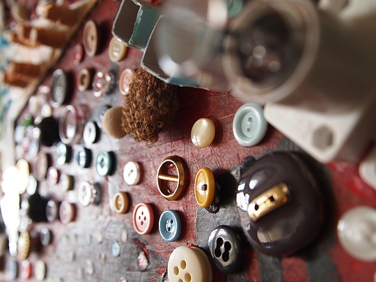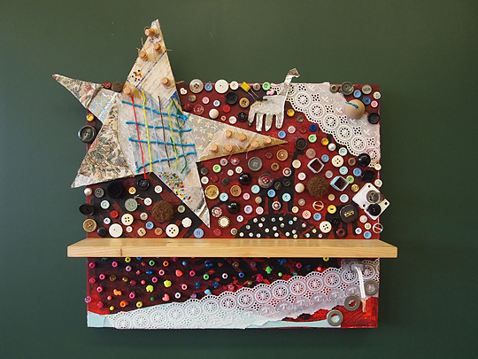 紙版画をして楽しんだ後のキャンバスに、ダンボール、ボタン、レース、ビーズ、布様々な素材をコラージュした飾り棚。